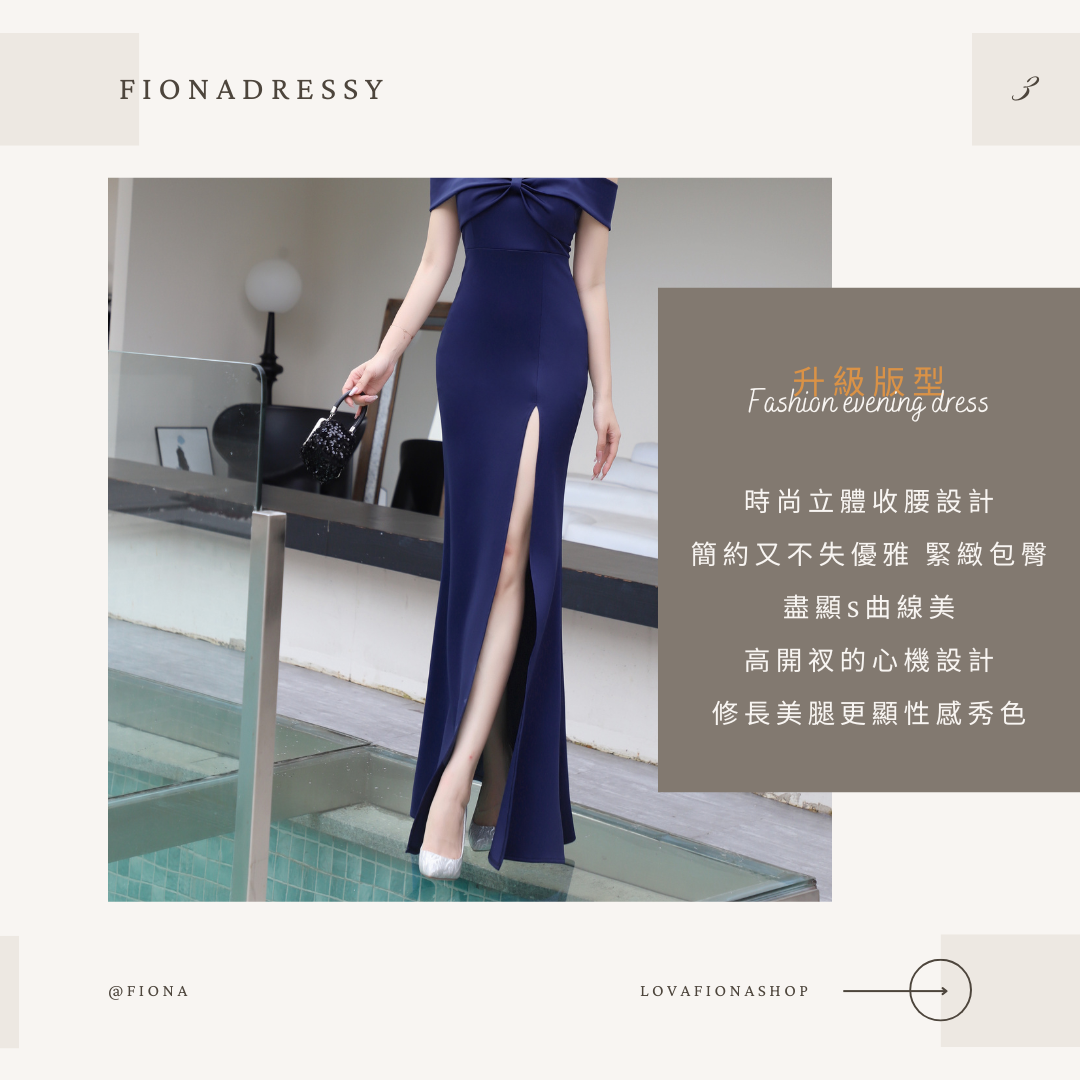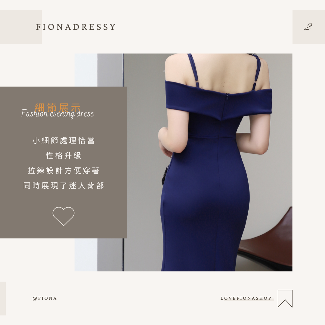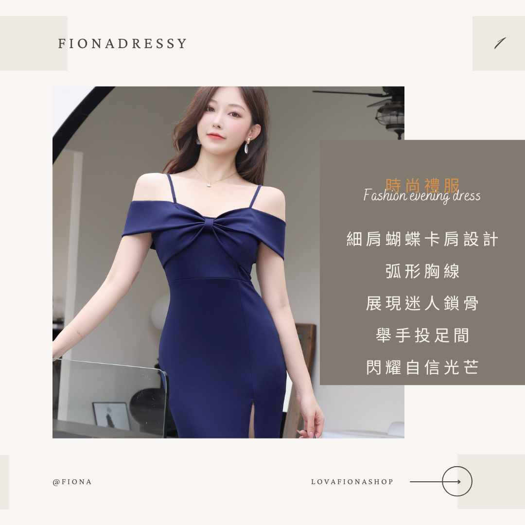深藍色細肩大蝴蝶結開衩長洋 (F9957-2)