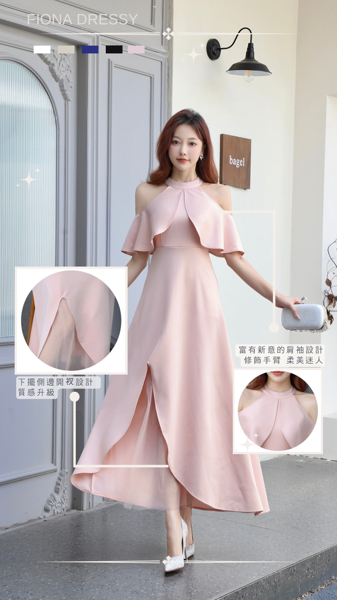 粉色挖肩下襬拼紗長洋 (F05)