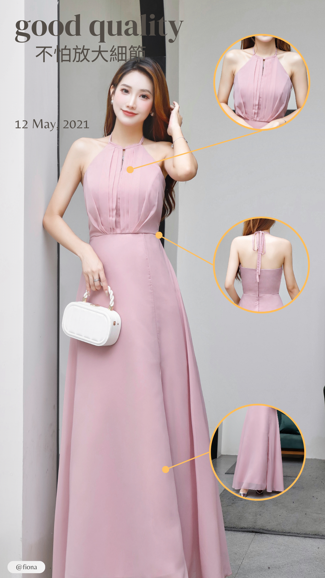 粉色鏤空掛脖側開衩雪紡禮服 (H051)