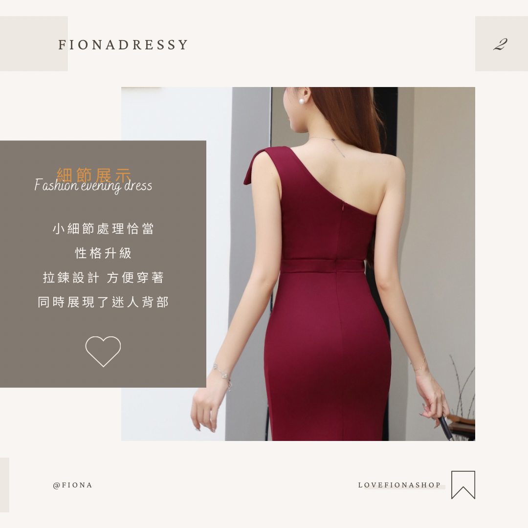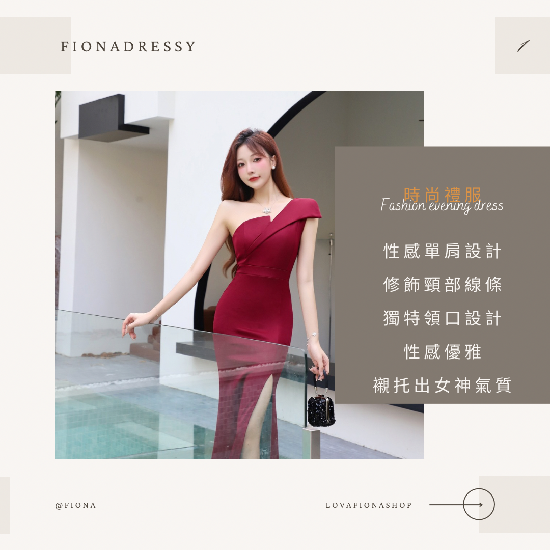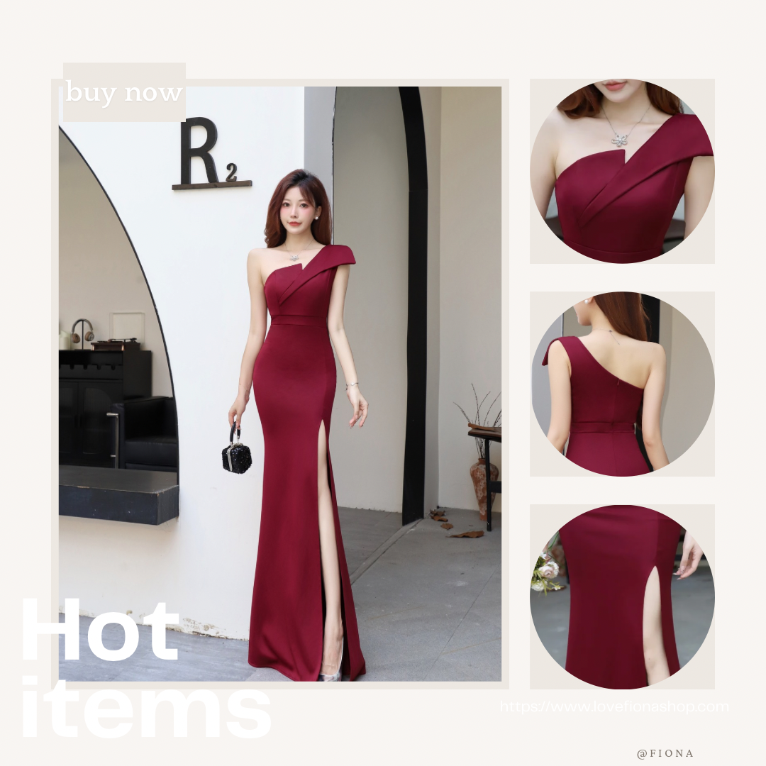 酒紅色單肩開衩長洋 (F9953)