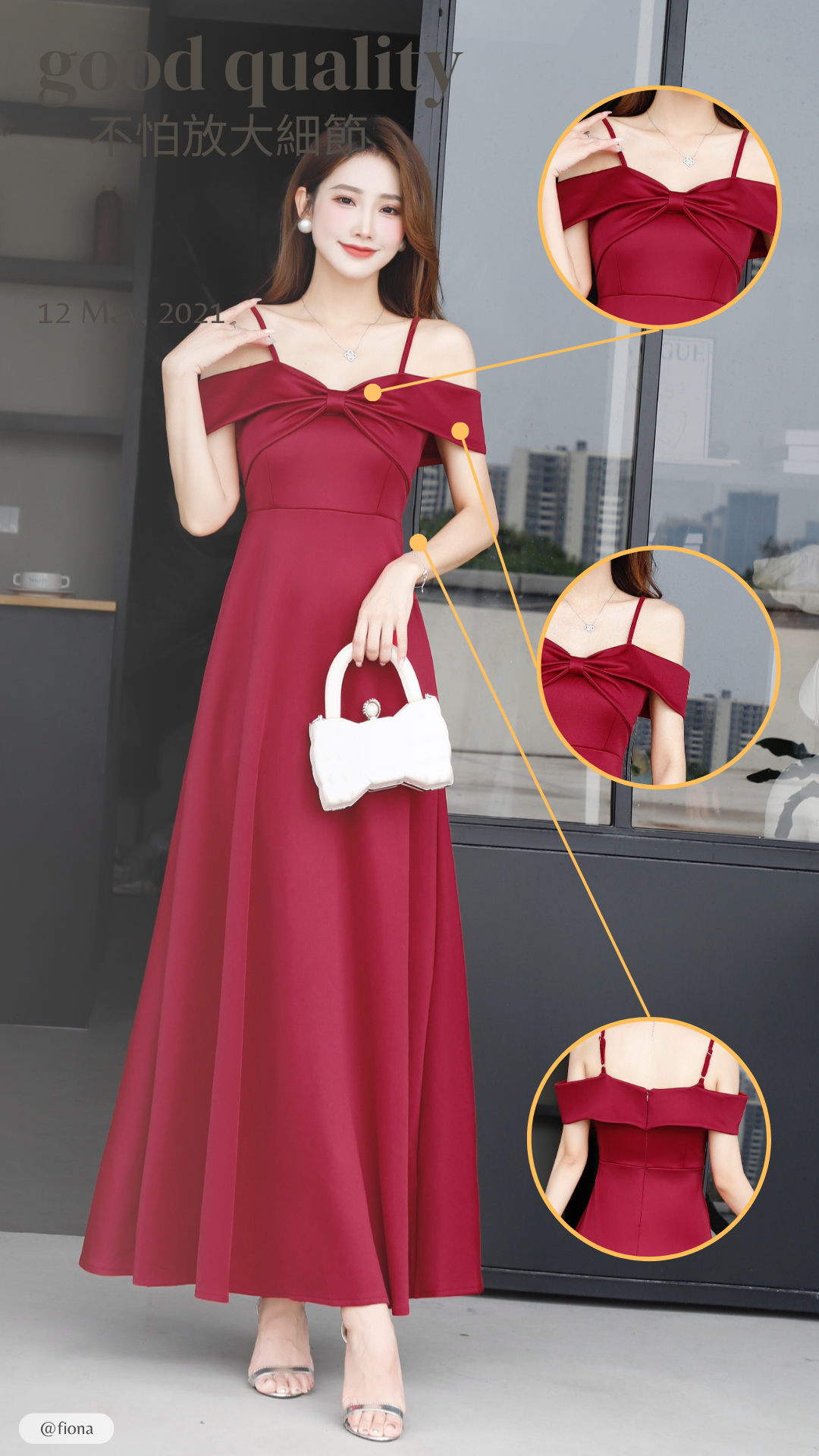 酒紅色蝴蝶結一字肩長洋 (F03)