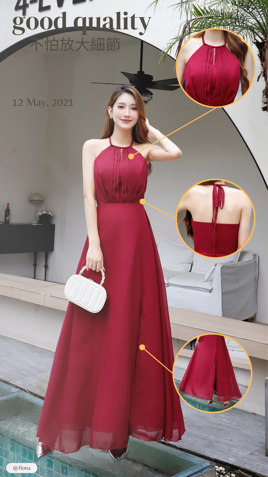酒紅色鏤空掛脖側開衩雪紡禮服 (H051)